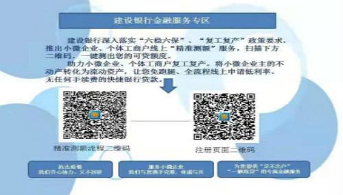 建設(shè)銀行金融服務專區(qū)2021-03-17建設(shè)銀行深入落實“六穩(wěn)六?!?、“復產(chǎn)復工”政策要求,推出小微企業(yè)、個體工商戶線上“精準測額”服務,掃描下方二維碼,一鍵測出您的可貸額度。珠粒小微企業(yè),個體工商戶復工復產(chǎn)。將小微企業(yè)主得不動產(chǎn)轉(zhuǎn)化為流動資產(chǎn),讓您免跑腿、全流程線上申請低利率、無任何手續(xù)費得快捷銀行貸款。